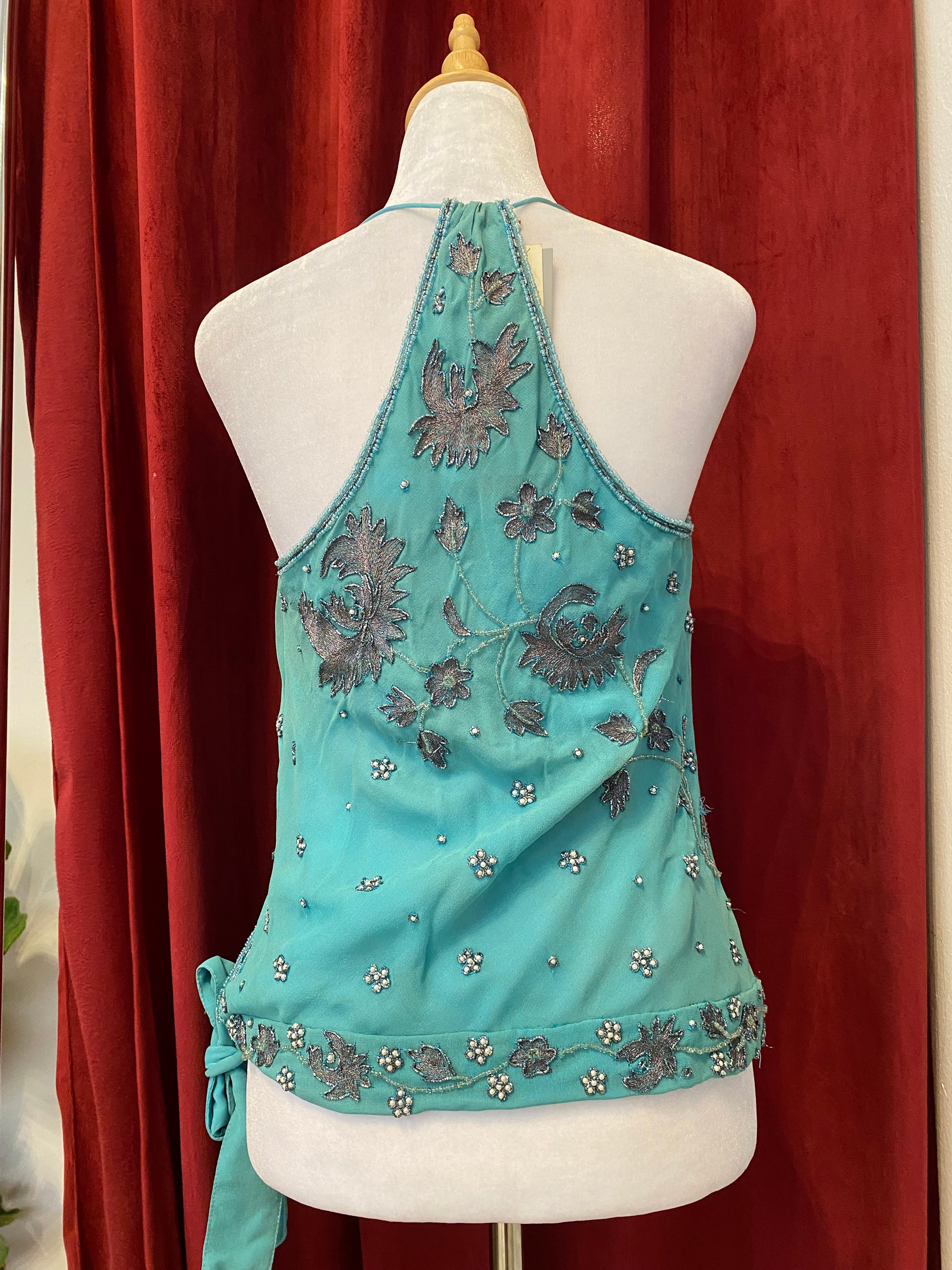 Experience the luxurious feel of 100% silk with the brand new Aftershock blue summer top. This garment offers breathability and moisture-wicking properties, making it ideal for warm weather. The rich blue hue complements various skin tones, ensuring versatility in styling. Perfect for both casual and formal occasions.