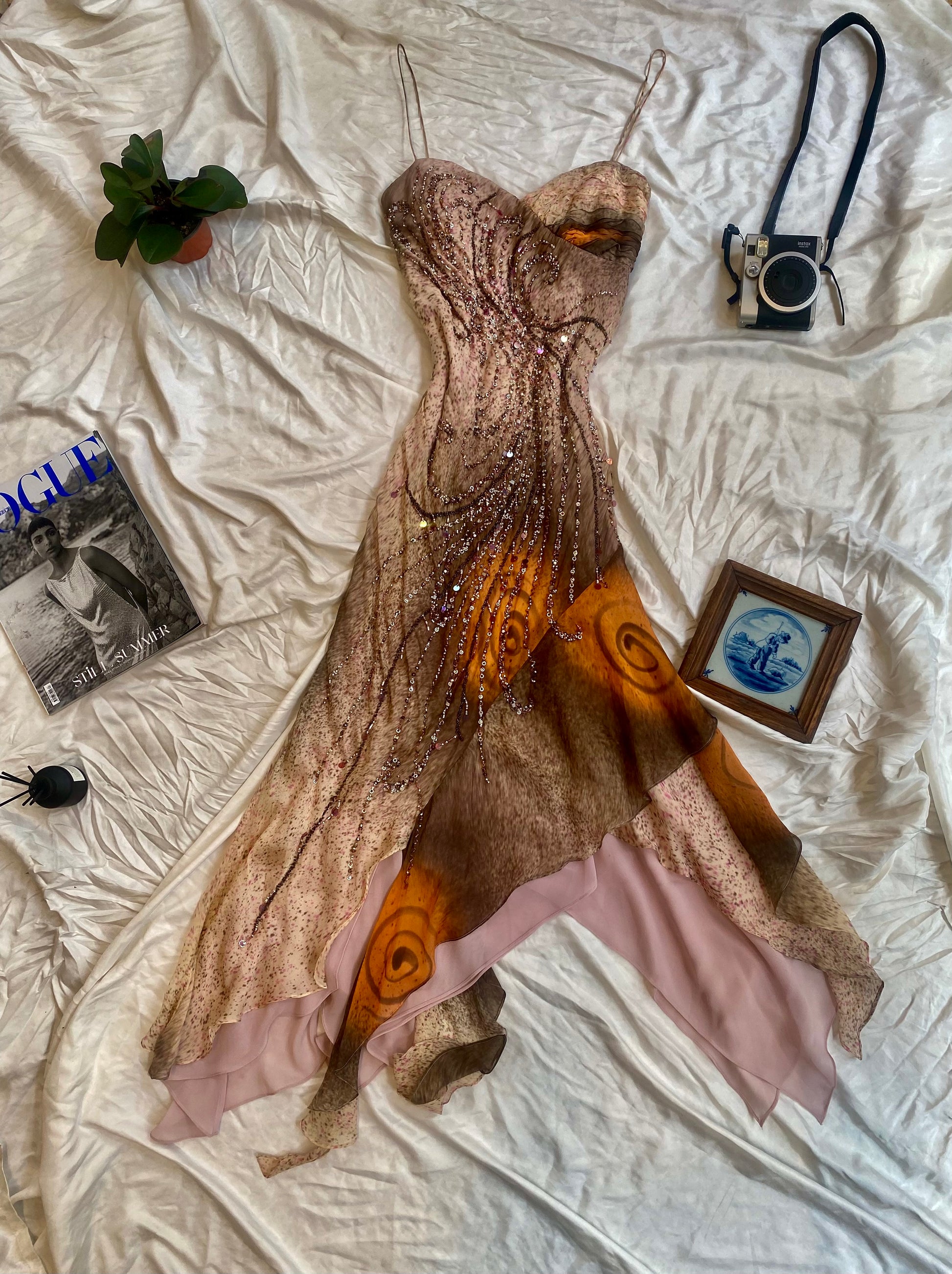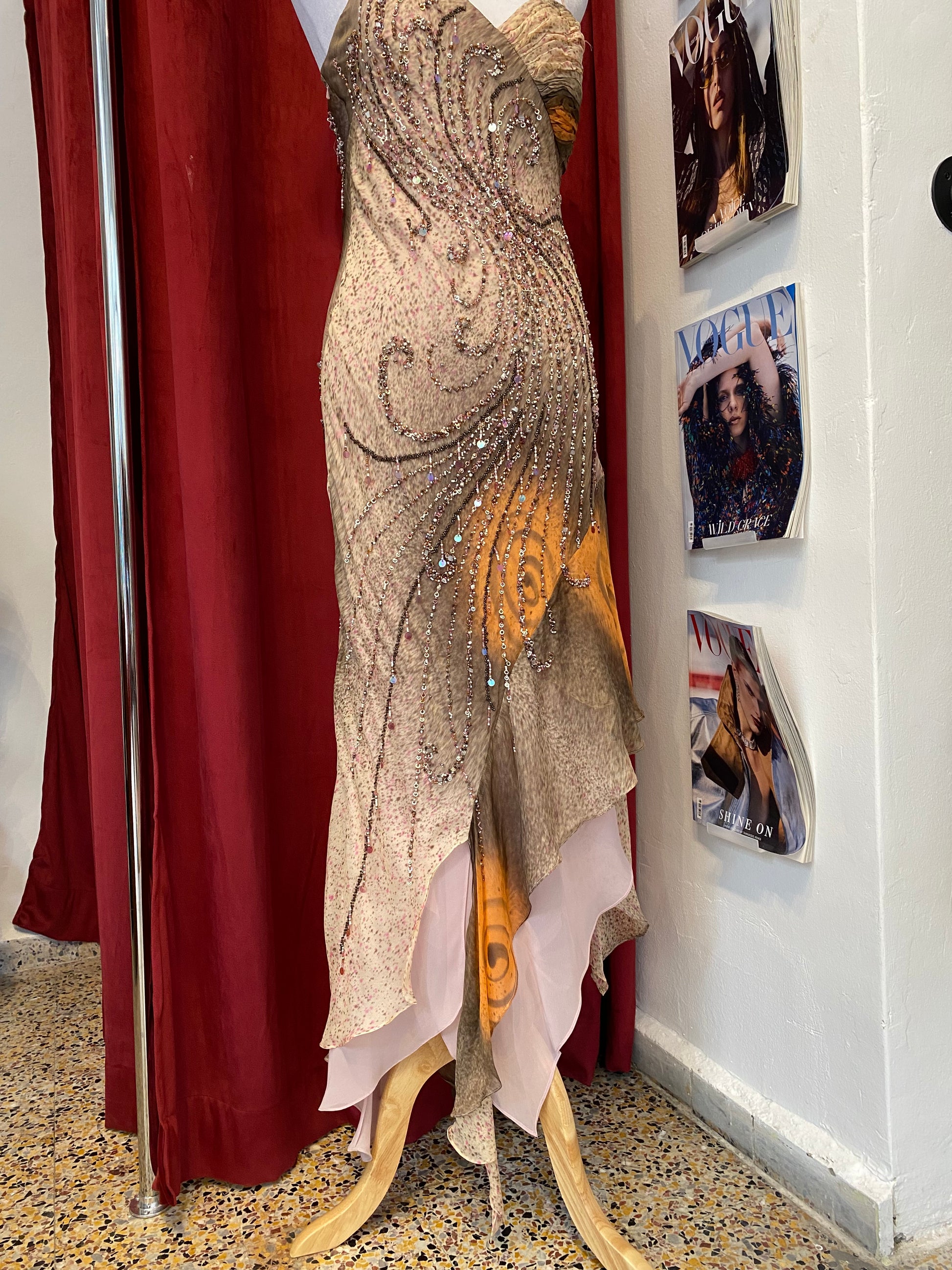 Expertly crafted with 100% silk and adorned with intricate hand-beaded embellishments, this brand new gown exudes elegance and luxury. Its timeless design and superior quality make it the perfect choice for any formal occasion. Experience the unparalleled comfort and style of this alluring dress.