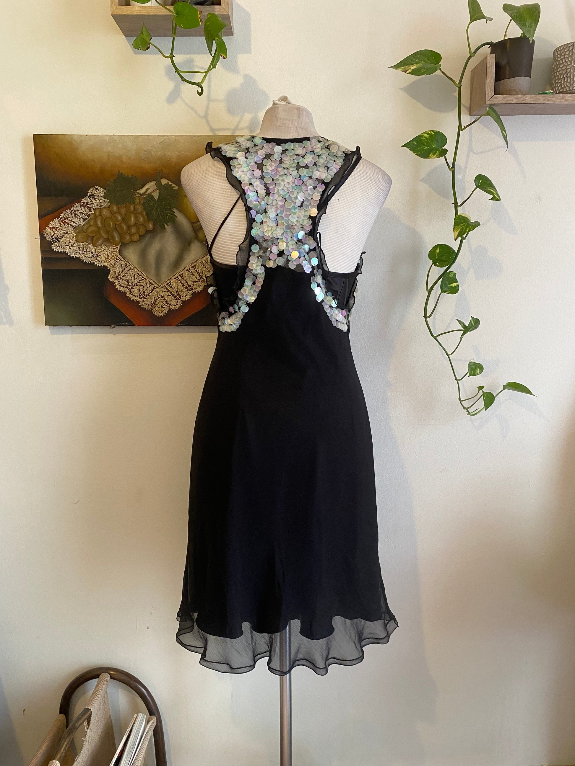 Indulge in luxury with our brand new 100% silk black dress. This 2 piece stunner features intricate sequin details, a satin dress underneath, and a silk top layer for a truly elegant and exclusive look. Elevate your style with this sophisticated piece.