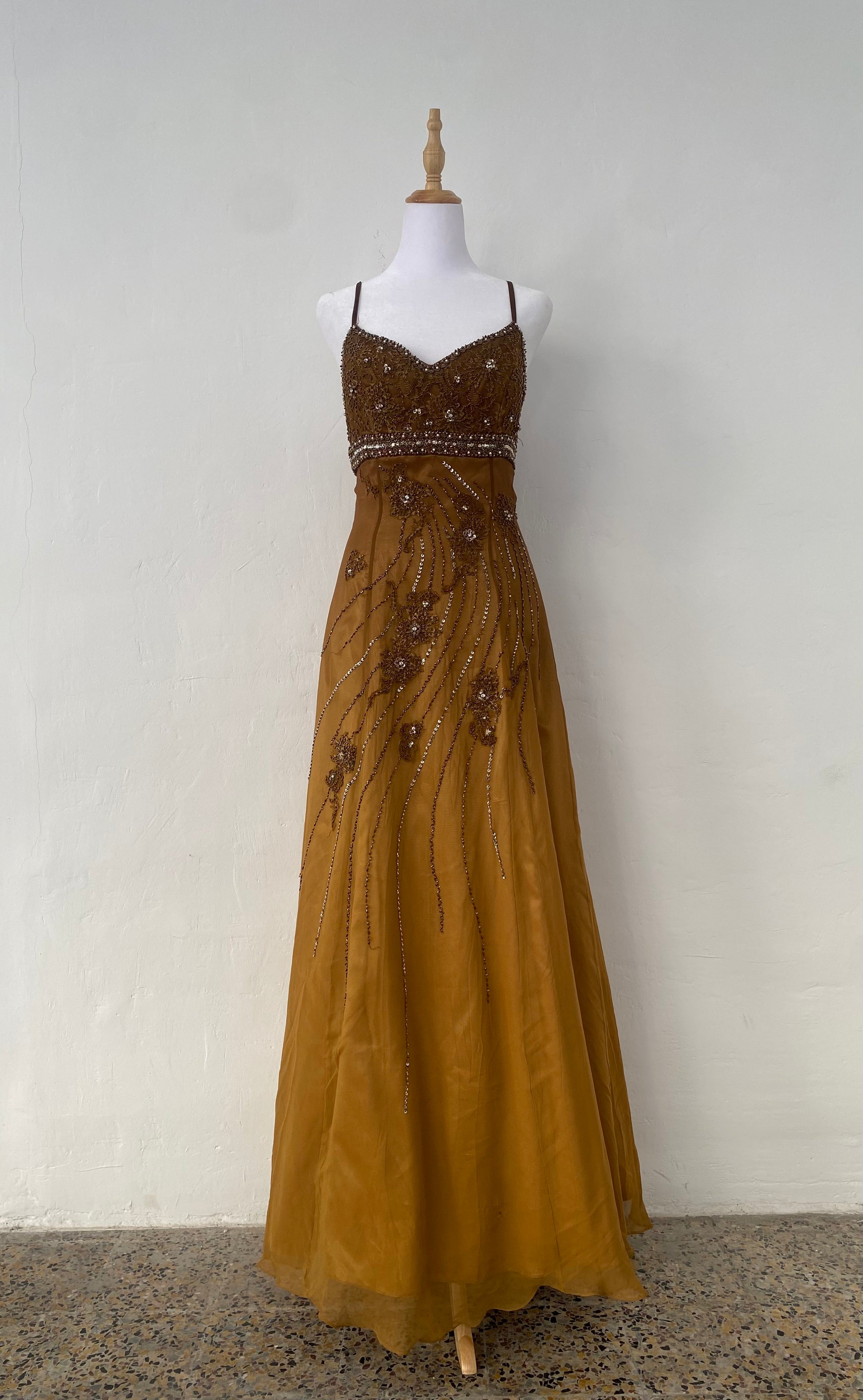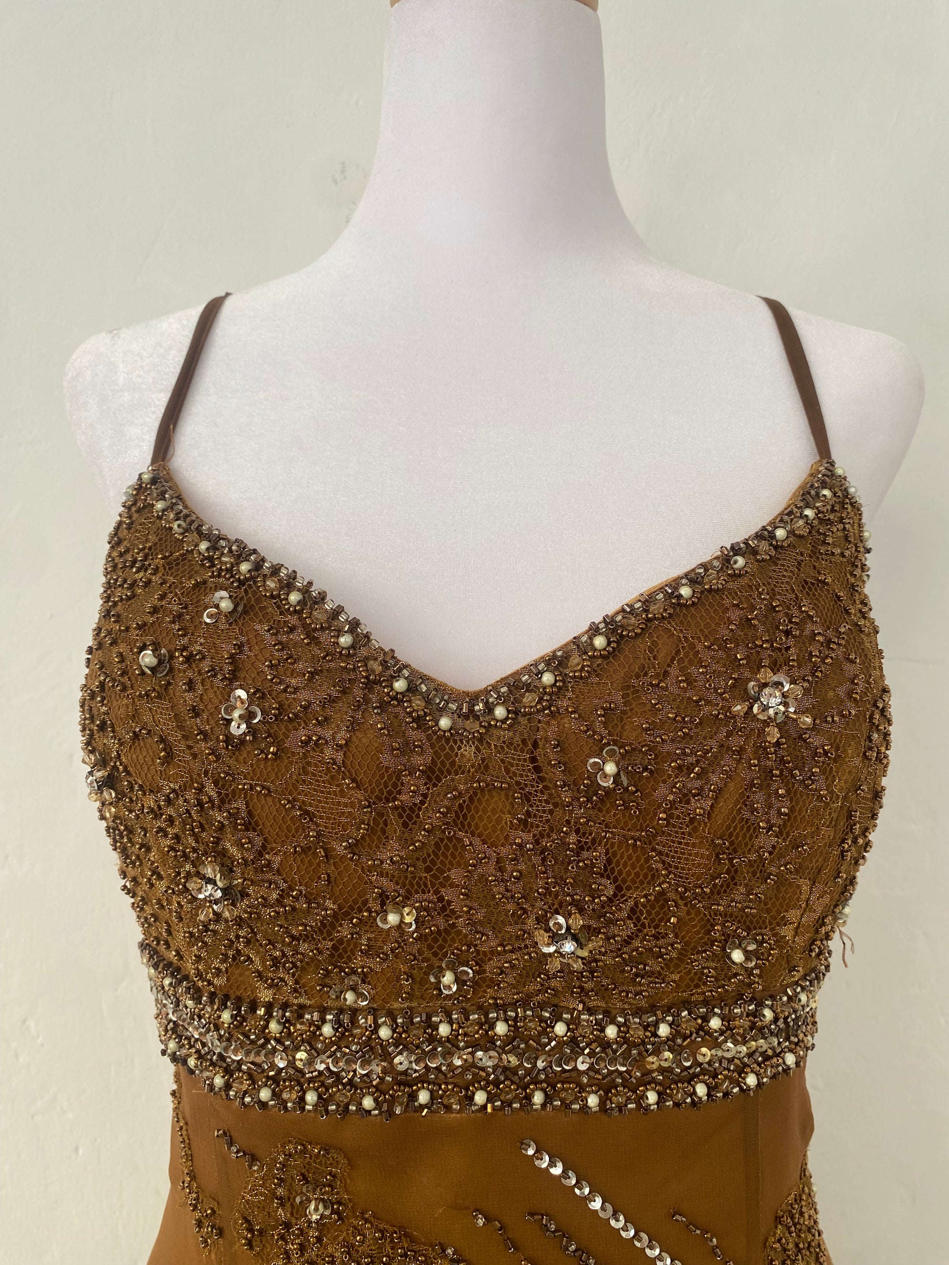 Indulge in luxury with our 100% silk brown handbeaded maxi dress. This brand new dress boasts intricate handbeaded detailing for a touch of elegance and charm. Perfect for any occasion, experience the softness and sophistication of this stunning dress.