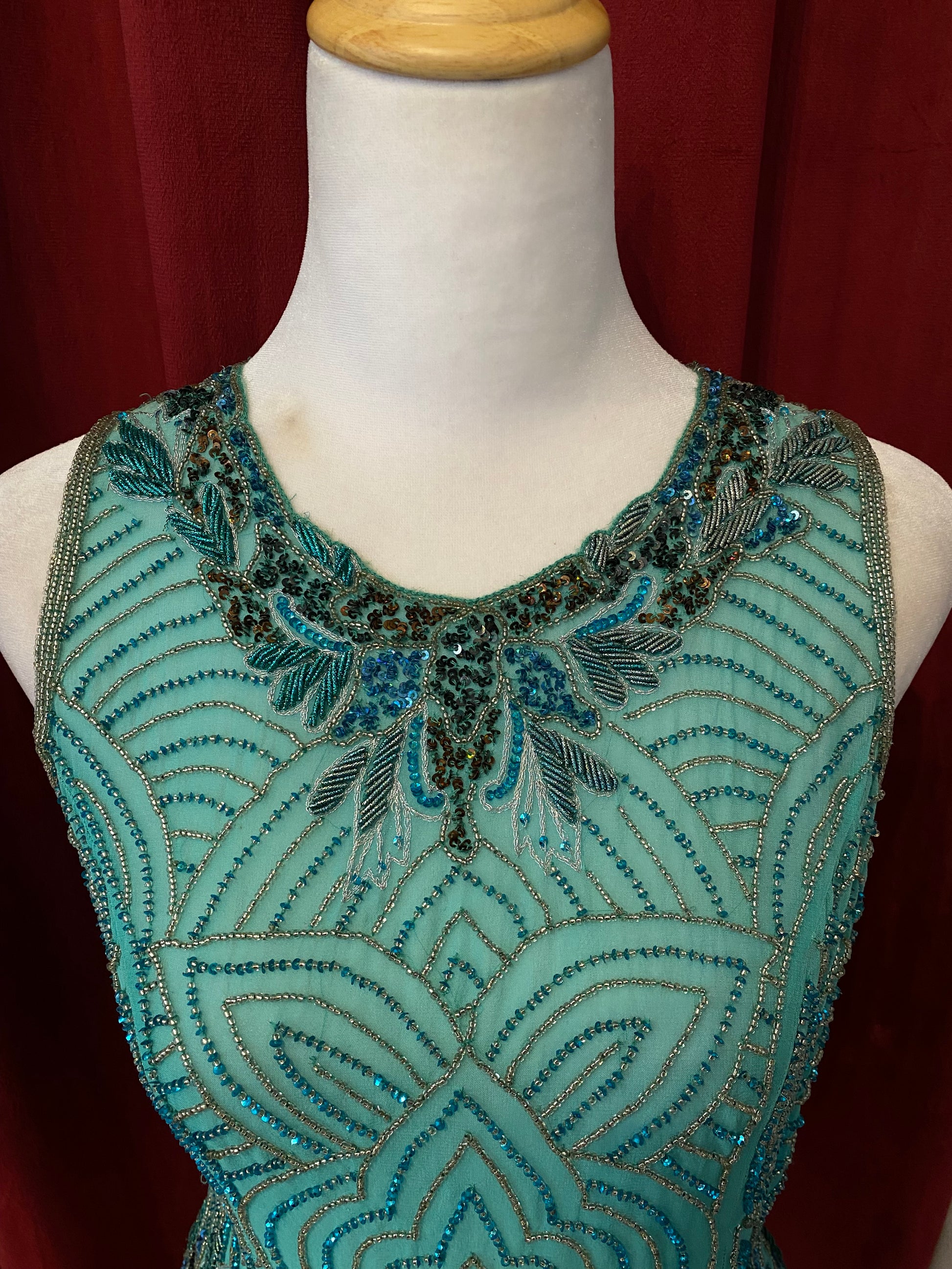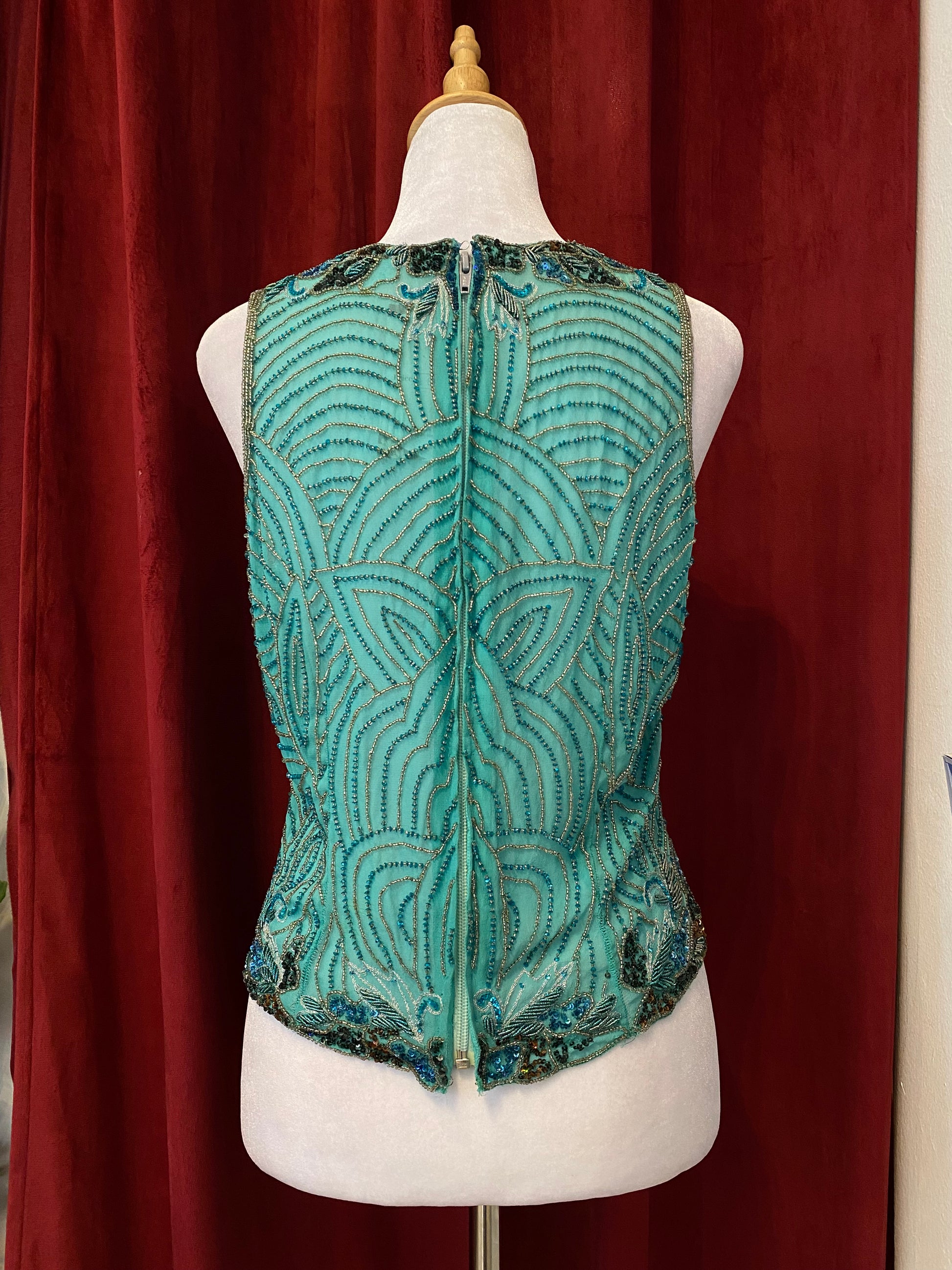 This 100% silk top features hand-beaded details in a light blue hue, offering both elegance and comfort. Silk is known for its breathable properties, while the intricate beading enhances the garment's visual appeal, making it suitable for both casual and formal occasions.