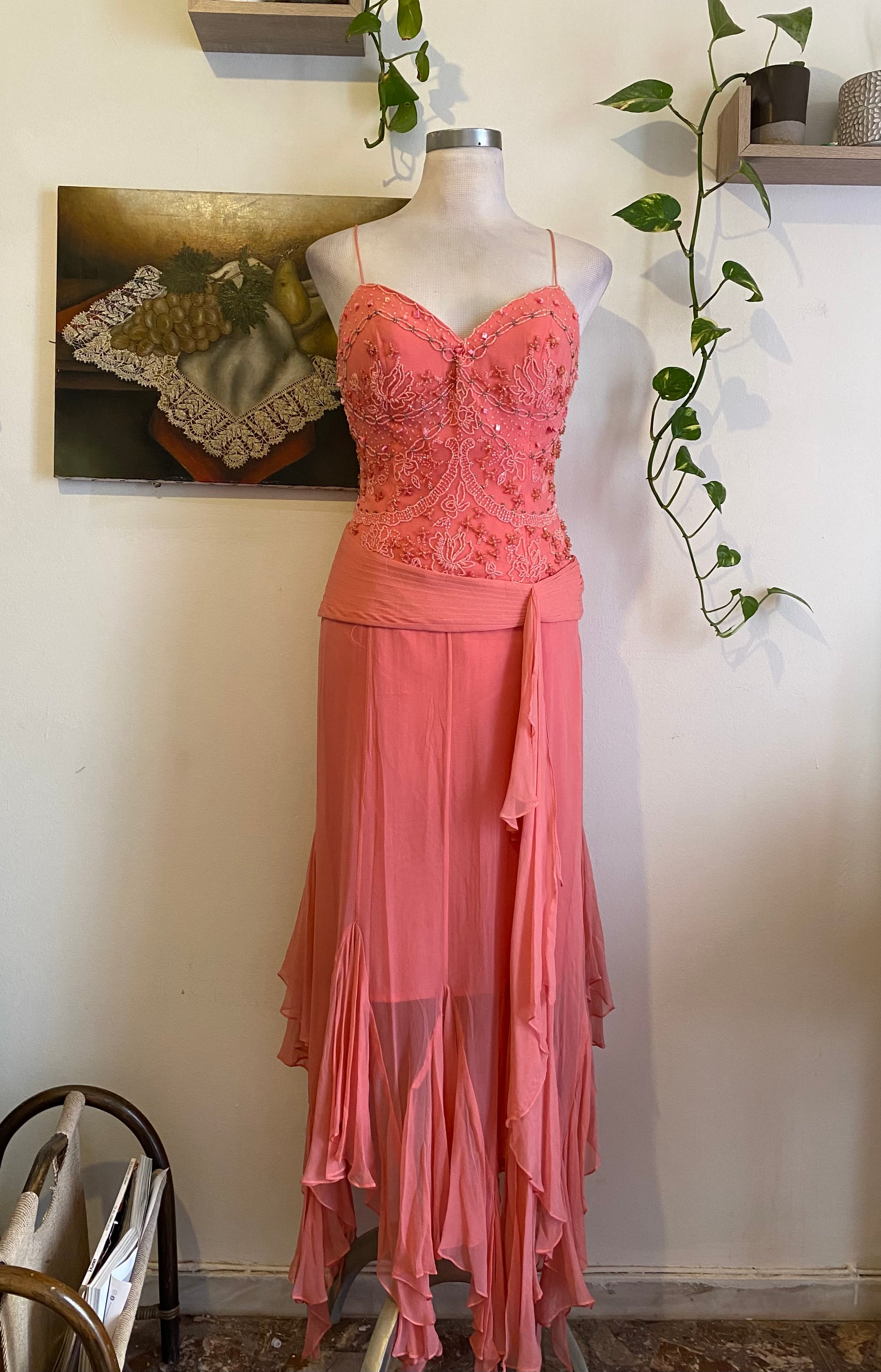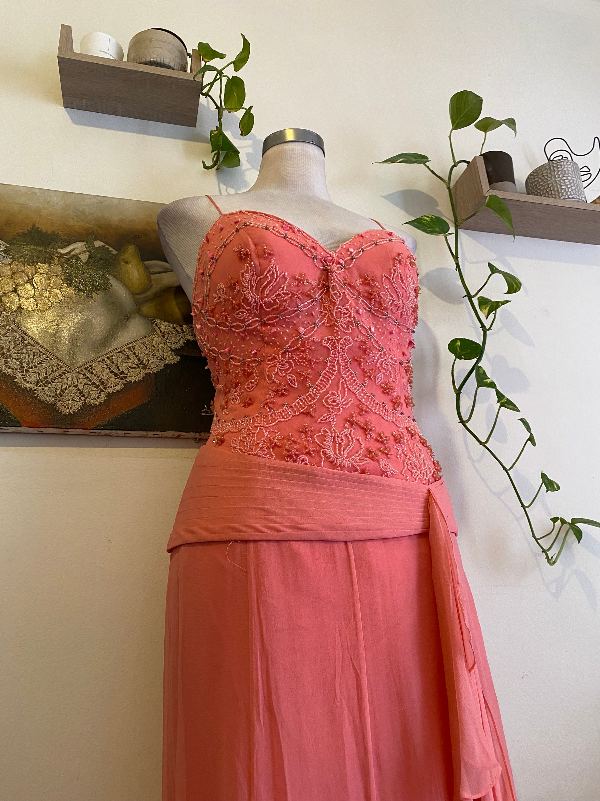 "Slip into silk perfection with our brand new hand-beaded pink gown. Made of 100% pure silk, this gown exudes luxury and elegance. Perfect for any formal occasion, you'll feel like a goddess in this one-of-a-kind piece. (No more polyester for you!)"