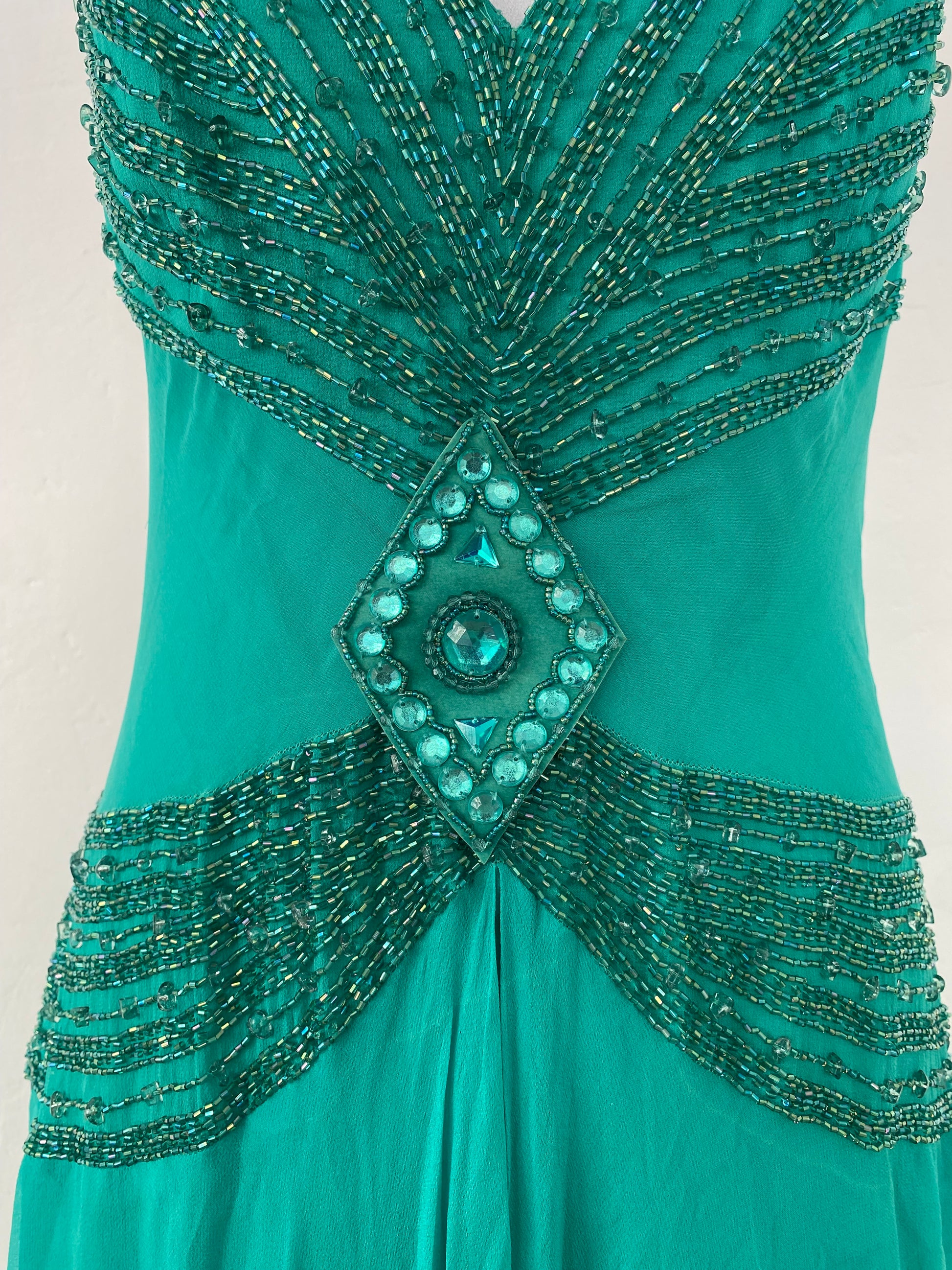 Experience luxury and elegance with our 100% silk, handbeaded turquoise maxi gown. Perfect for any special occasion, the intricate beadwork adds a touch of glamour while the silk fabric provides comfort and sophistication. Make a statement with this brand new, high-quality gown that is sure to turn heads.