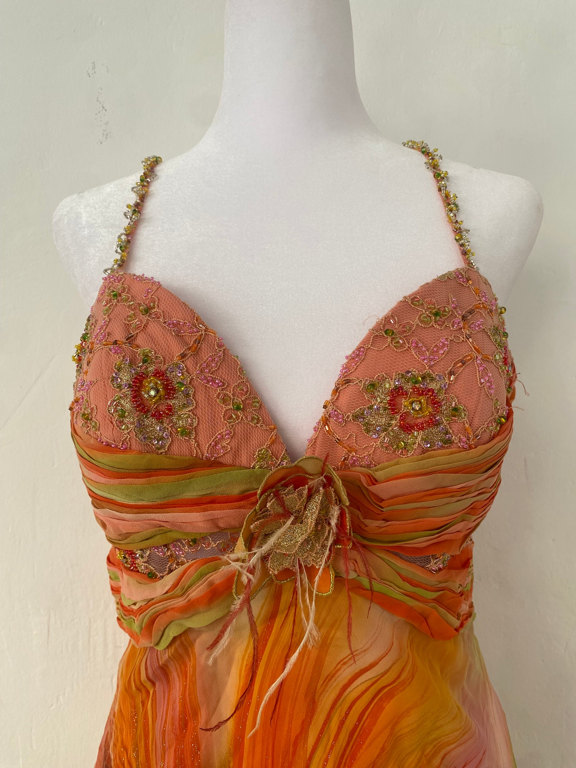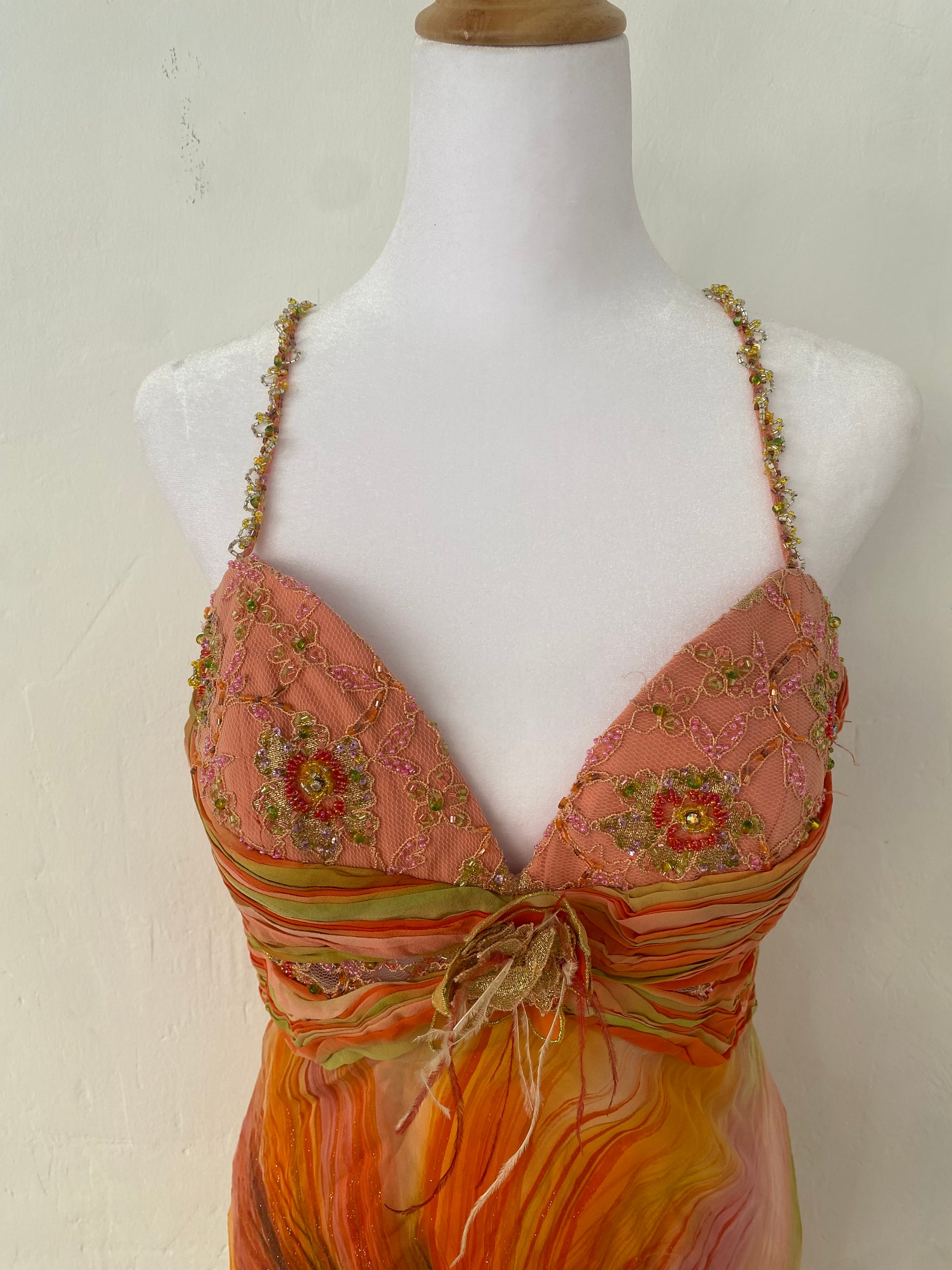"Twirl into the sunset in our 100% silk gown, adorned with handbeaded details. Elevate your style with this brand new, luxurious piece. Perfect for a night out or special occasion. (Warning: Envy may occur with every wear!)"
