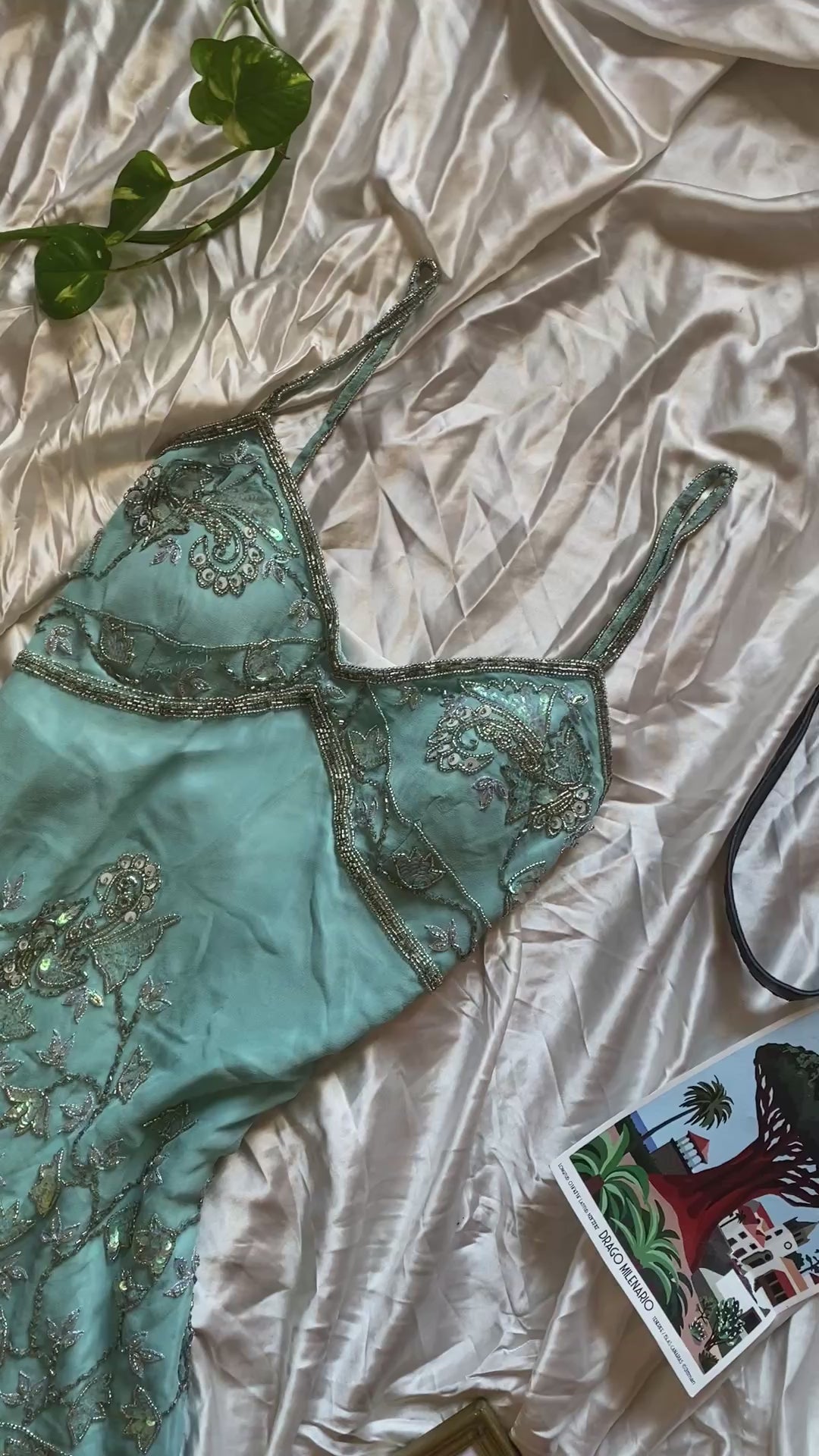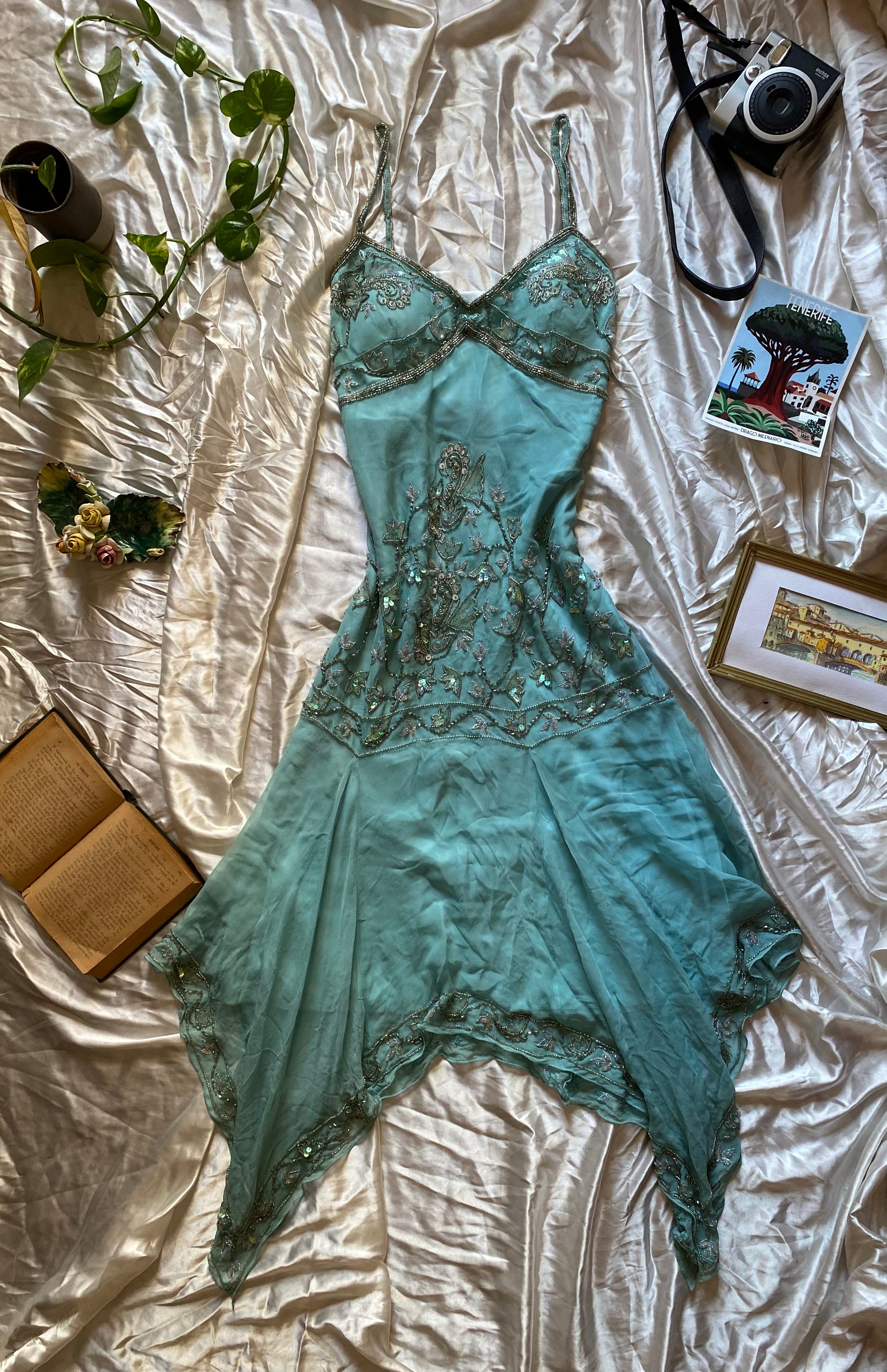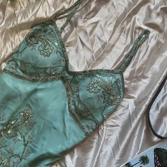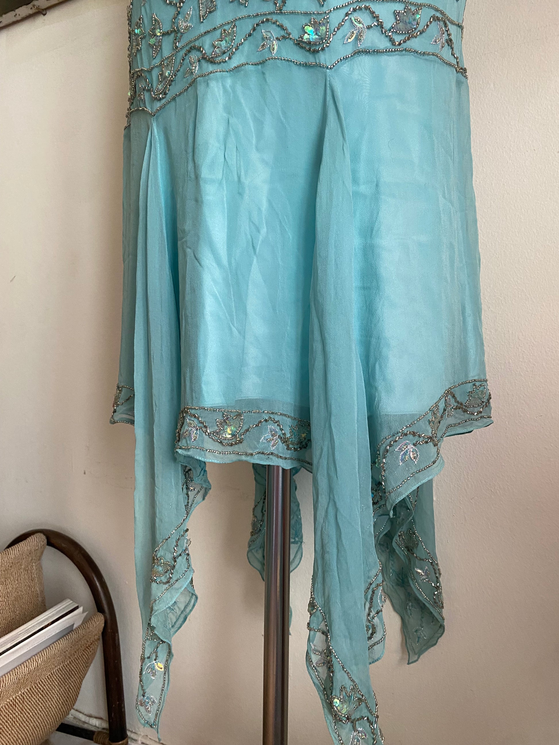 100% silk fairy baby blue gown with handbeaded details all over