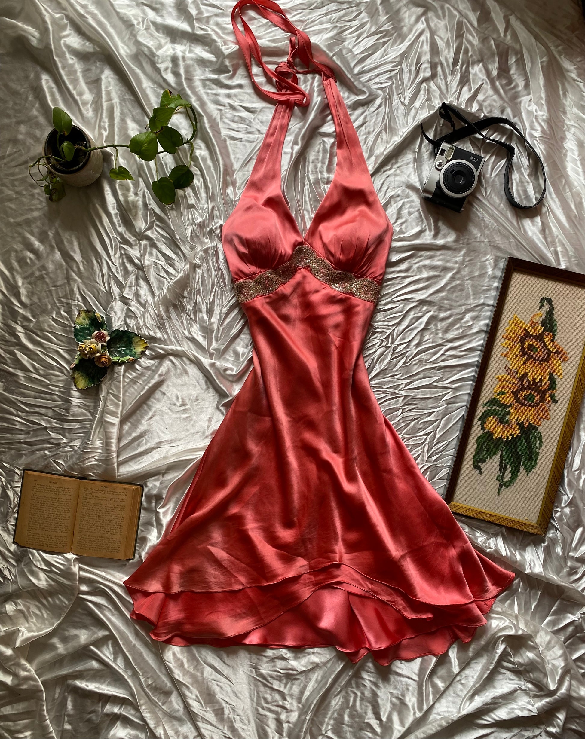 Crafted with 100% silk, this halter coral dress exudes elegance and luxury. With its lightweight and breathable fabric, it offers comfort and a flattering fit. The perfect choice for special occasions or a night out, this dress is both timeless and stylish.