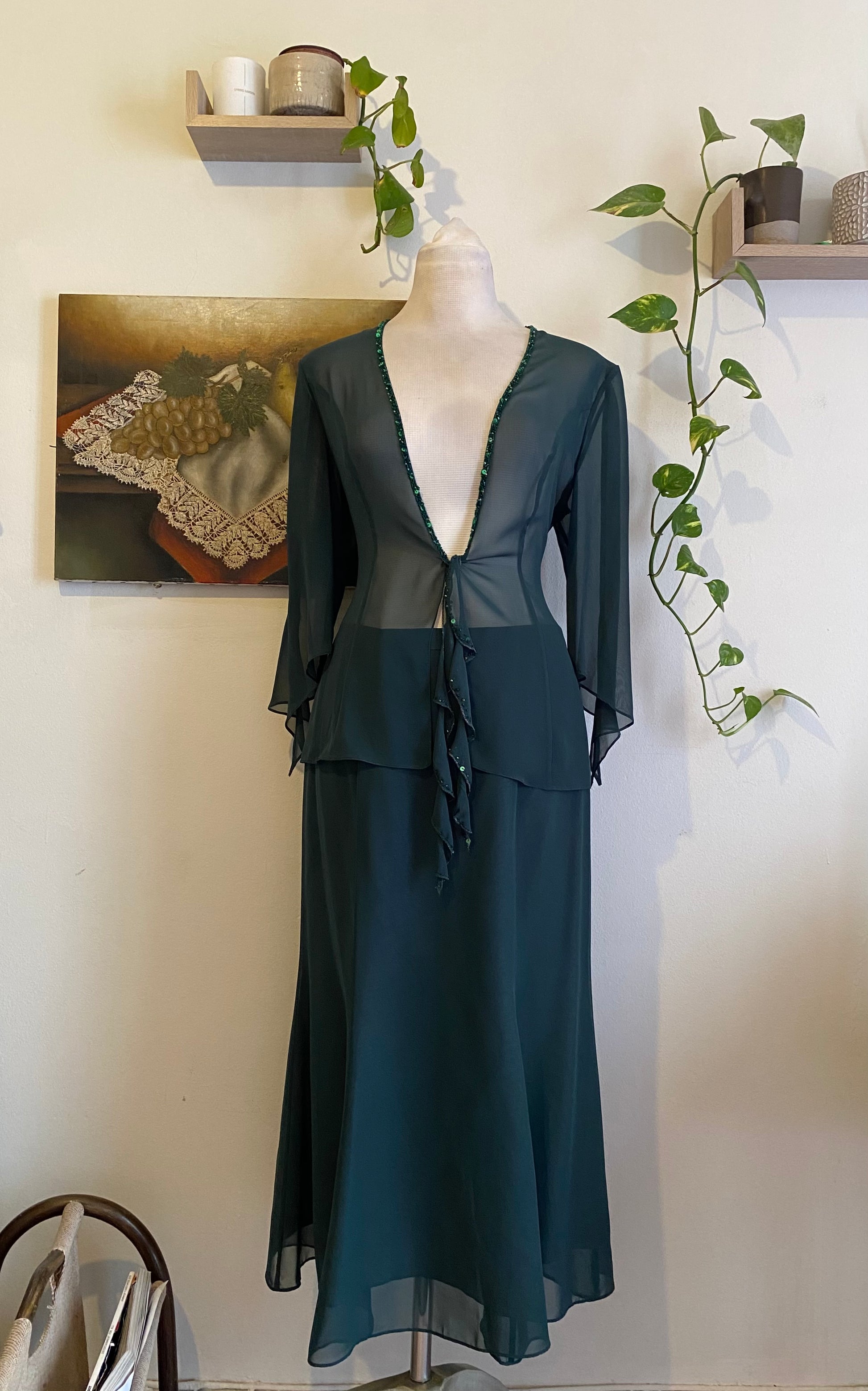 Indulge in luxury with our 2 piece brand new emerald set. The intricate sequin details add a touch of sophistication to this exclusive ensemble. The elastic detail on the skirt provides both comfort and style. Elevate your wardrobe with this stunning piece.