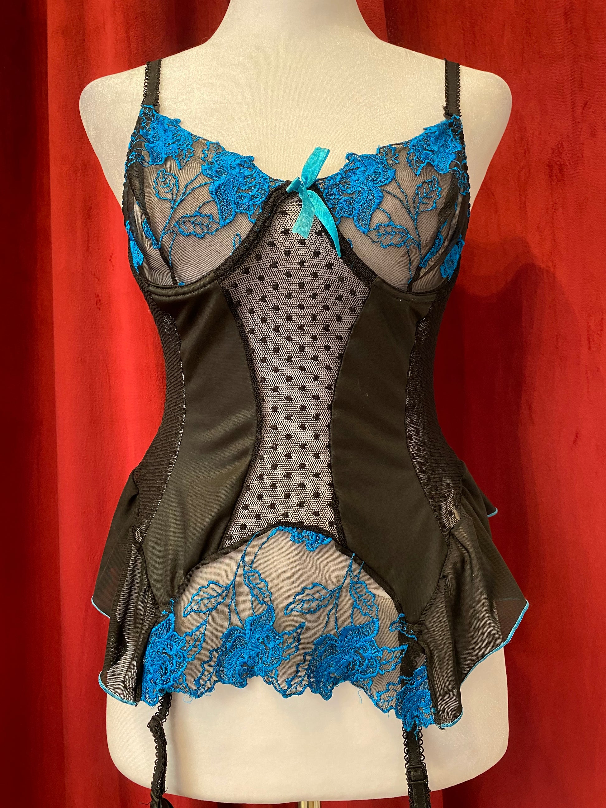 This black corset with blue hints and lace up details in the back is perfect for accentuating your waist while adding a touch of elegance to any outfit. The blue hints add a pop of color while the lace up back provides a customizable fit. Elevate your style with this must-have corset.