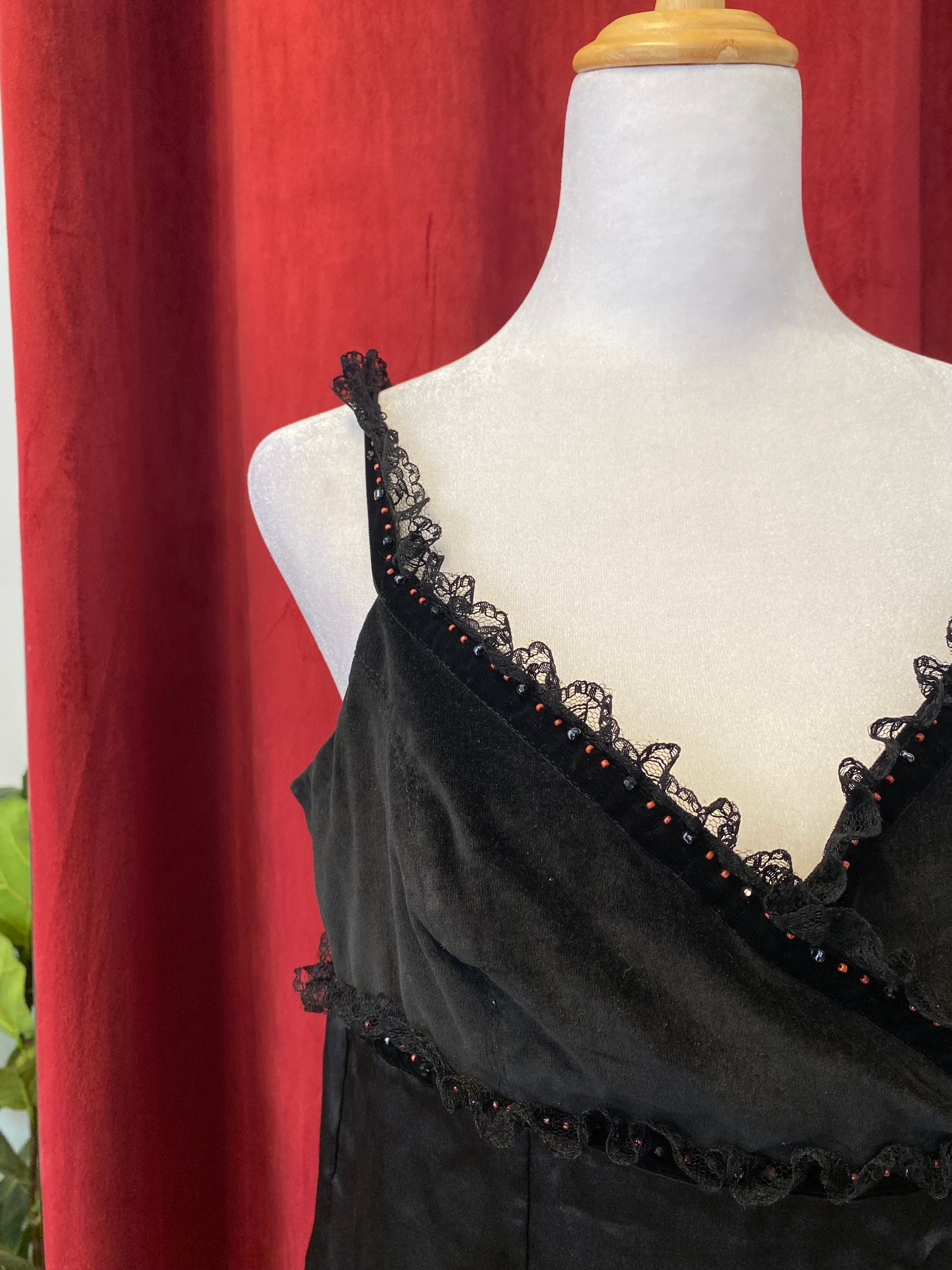 This black velvet top showcases intricate lace and sparkling sequin details. The luxurious fabric creates a sleek and elegant look, while the lace and sequin accents add a touch of glamour. Perfect for any special occasion or a night out, this top will make you feel stylish and sophisticated.