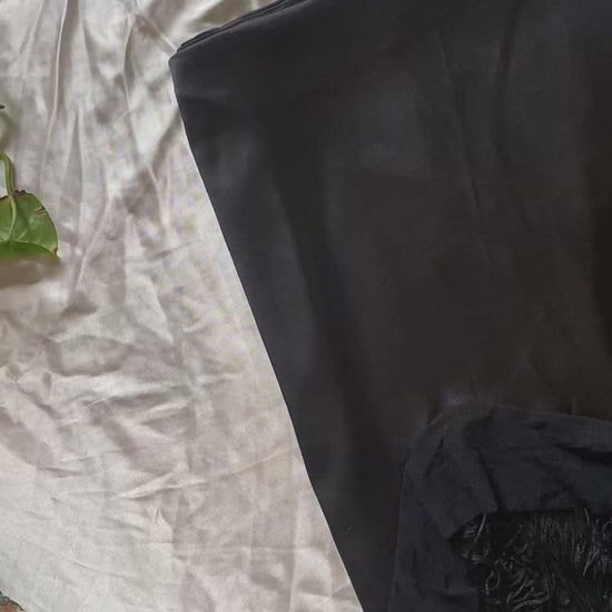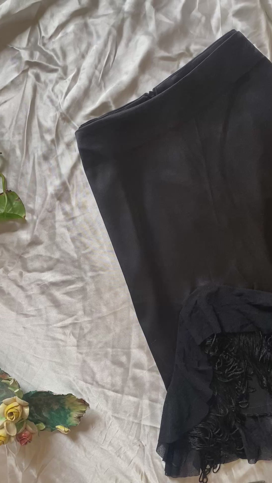 This black asymmetrical satin skirt is a brand new addition to your wardrobe. The fringe details add a touch of texture and interest, making it perfect for any occasion. Made with high-quality satin, it offers both style and comfort. Elevate your look with this chic and versatile skirt.
