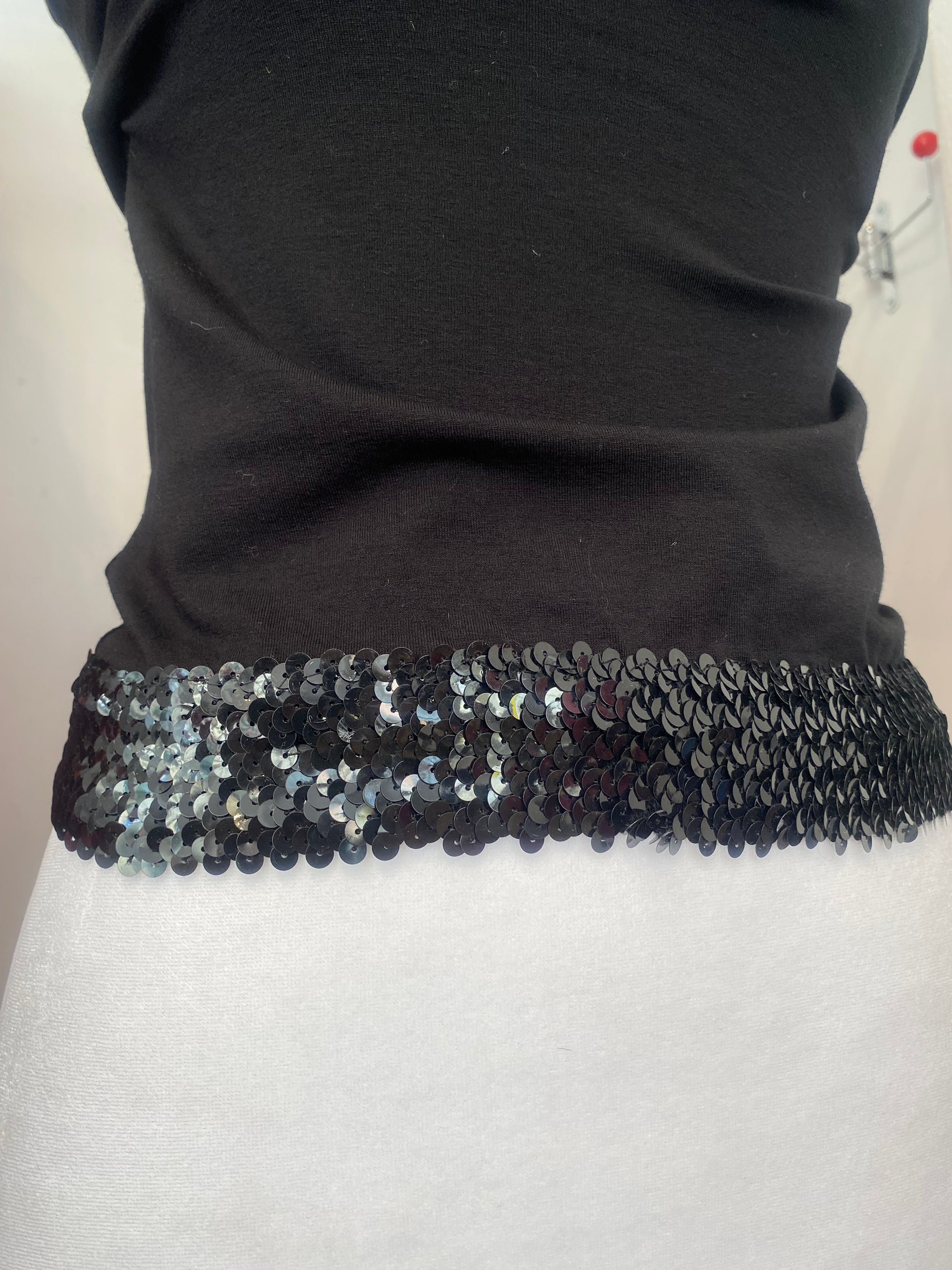 This brand new black halter top boasts elegant sequin details for a touch of glamour. Designed with a halter neckline, it offers a sleek and flattering fit. Perfect for any occasion, this sequin halter top is a must-have addition to your wardrobe.