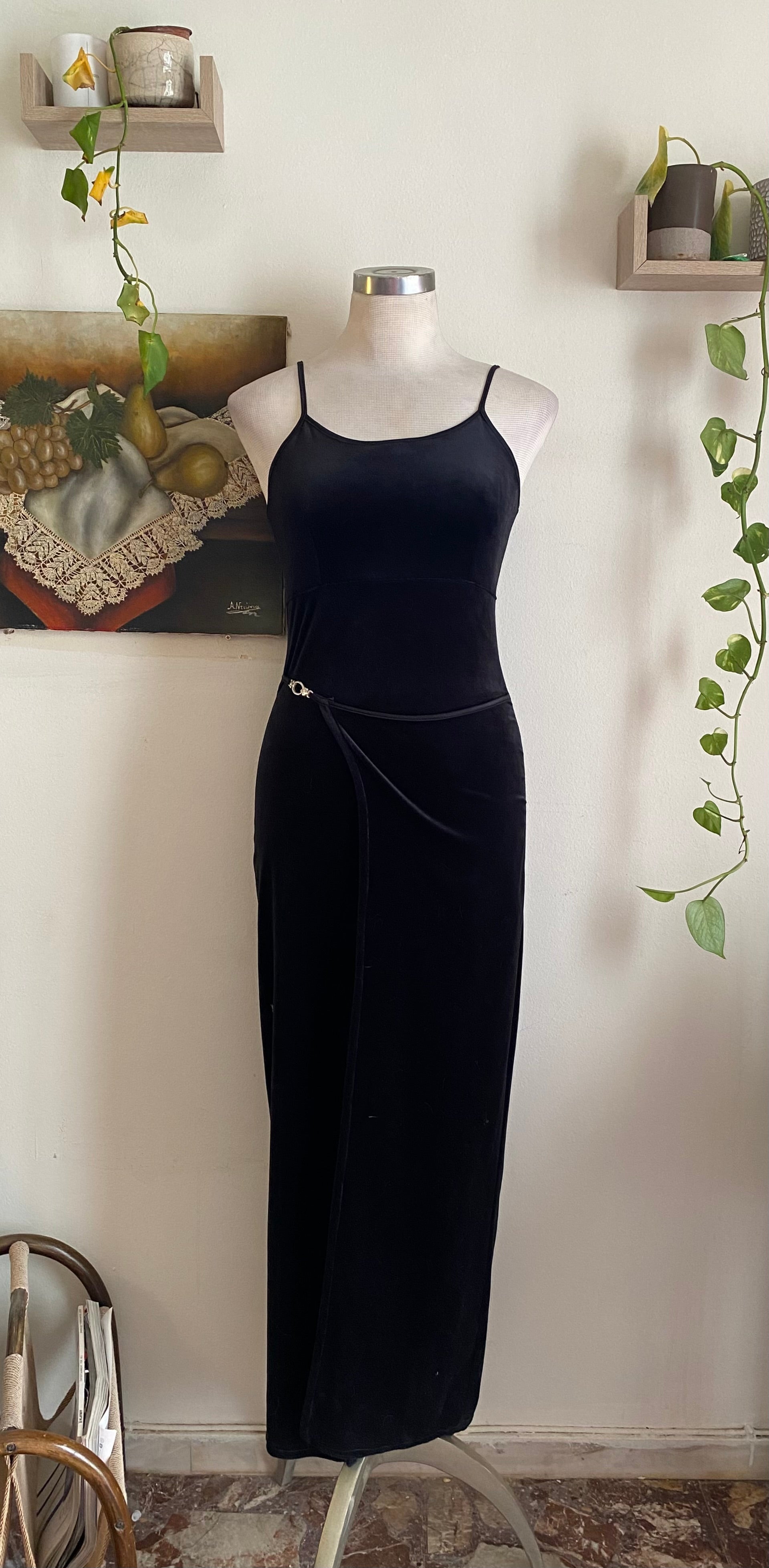 I Indulge in luxury with our brand new black maxi velvet dress. Featuring elegant buckle details, this dress exudes sophistication and exclusivity. Its soft velvet fabric adds a touch of opulence, making you stand out in any occasion. Elevate your style with this must-have piece.