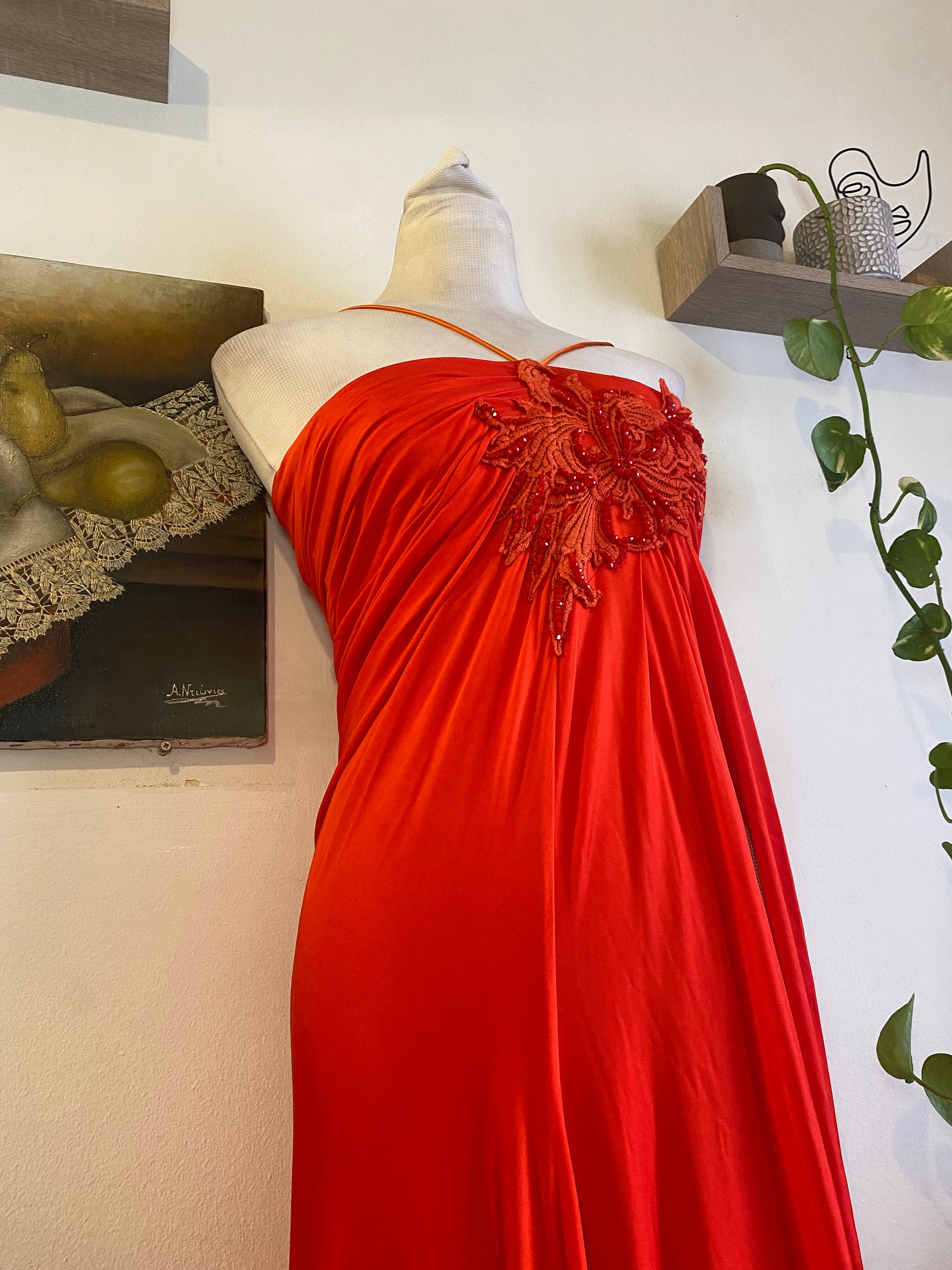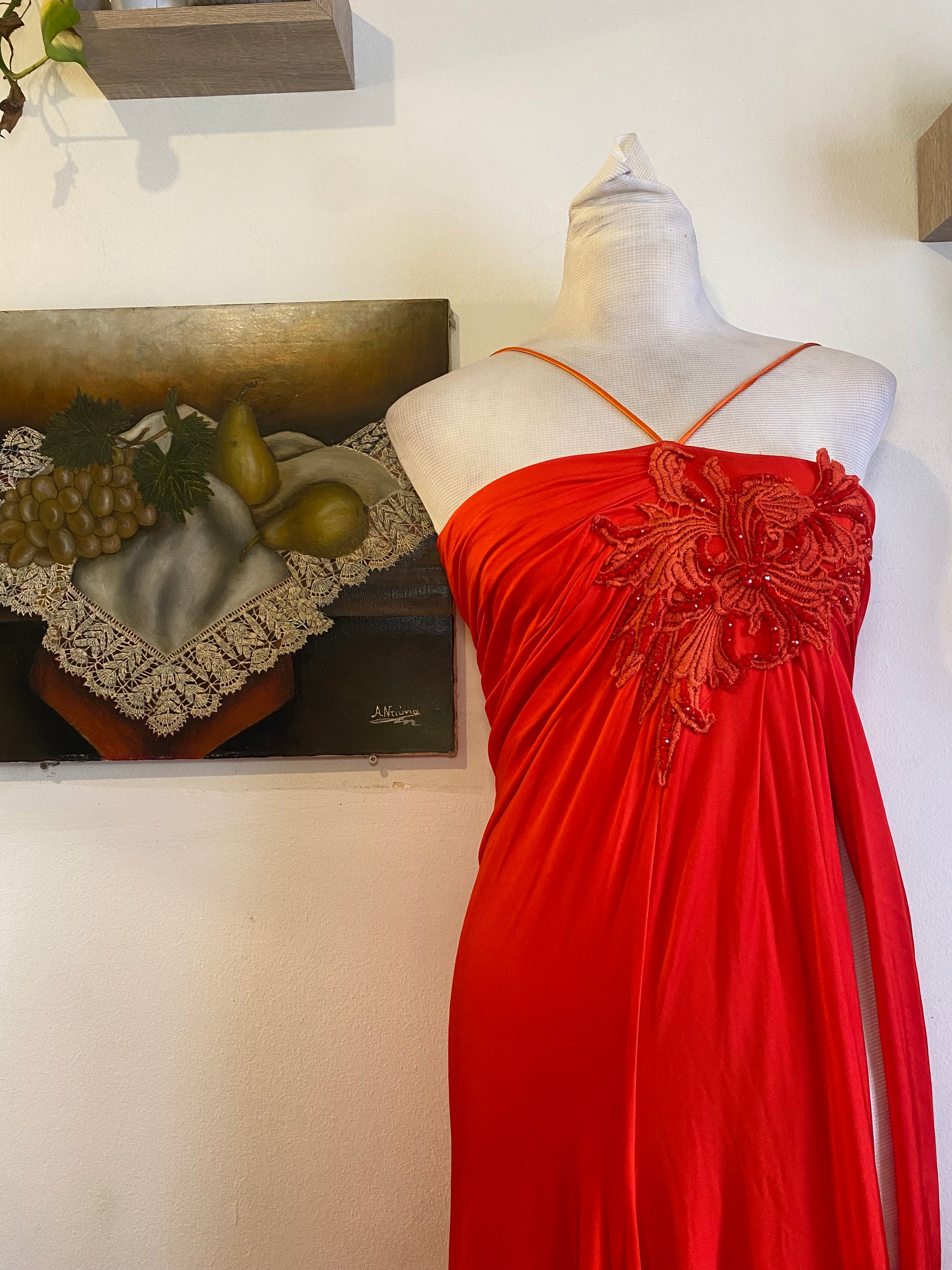This brand new haute couture dress features a high slit and orange rushed up detailing. Elegantly designed with luxurious fabric, it exudes sophistication and exclusivity. Perfect for high-end events and formal occasions, this dress will make a statement and elevate your style.