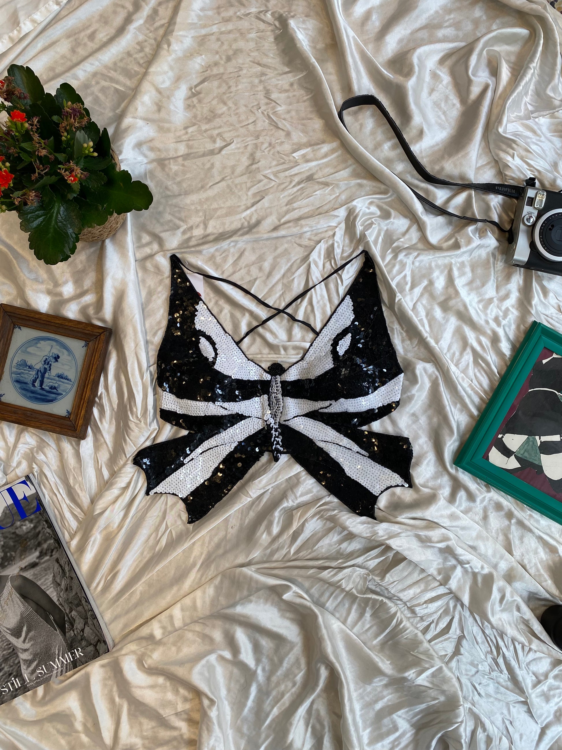 "Get ready to flutter into style with our Butterfly y2k top! Featuring sparkling sequin details and a daring open back, this top is perfect for adding a touch of glamour to any outfit. Embrace your playful side and stand out in the crowd with this unique and trendy piece."