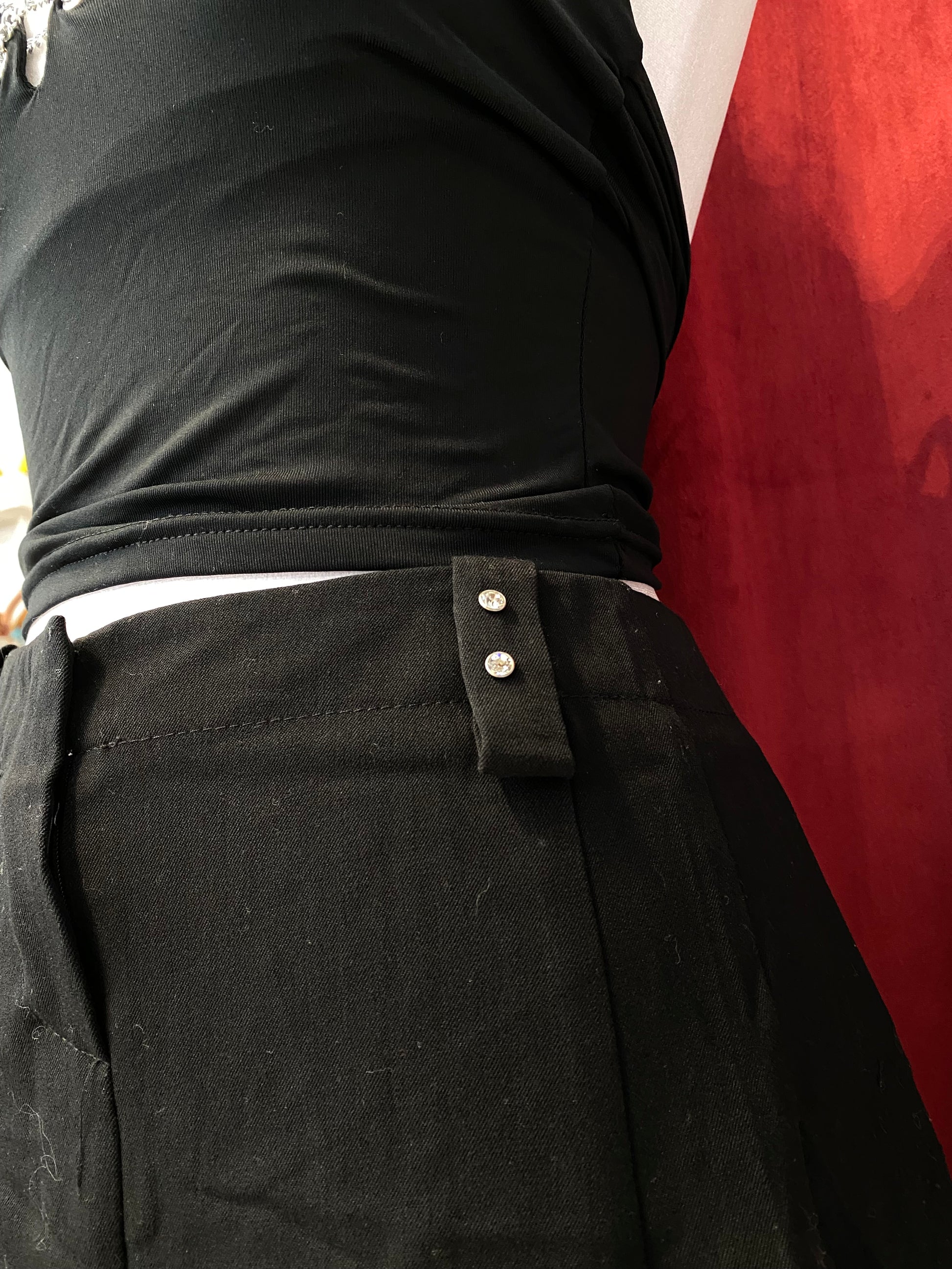 The Mini Black Ruffled Skirt with Rhinestone Details combines elegance and subtle glamour. Crafted from quality materials, this skirt features ruffled layers that enhance movement, while strategically placed rhinestones add a touch of sparkle. Ideal for various occasions, it allows for versatile styling options to elevate your wardrobe.