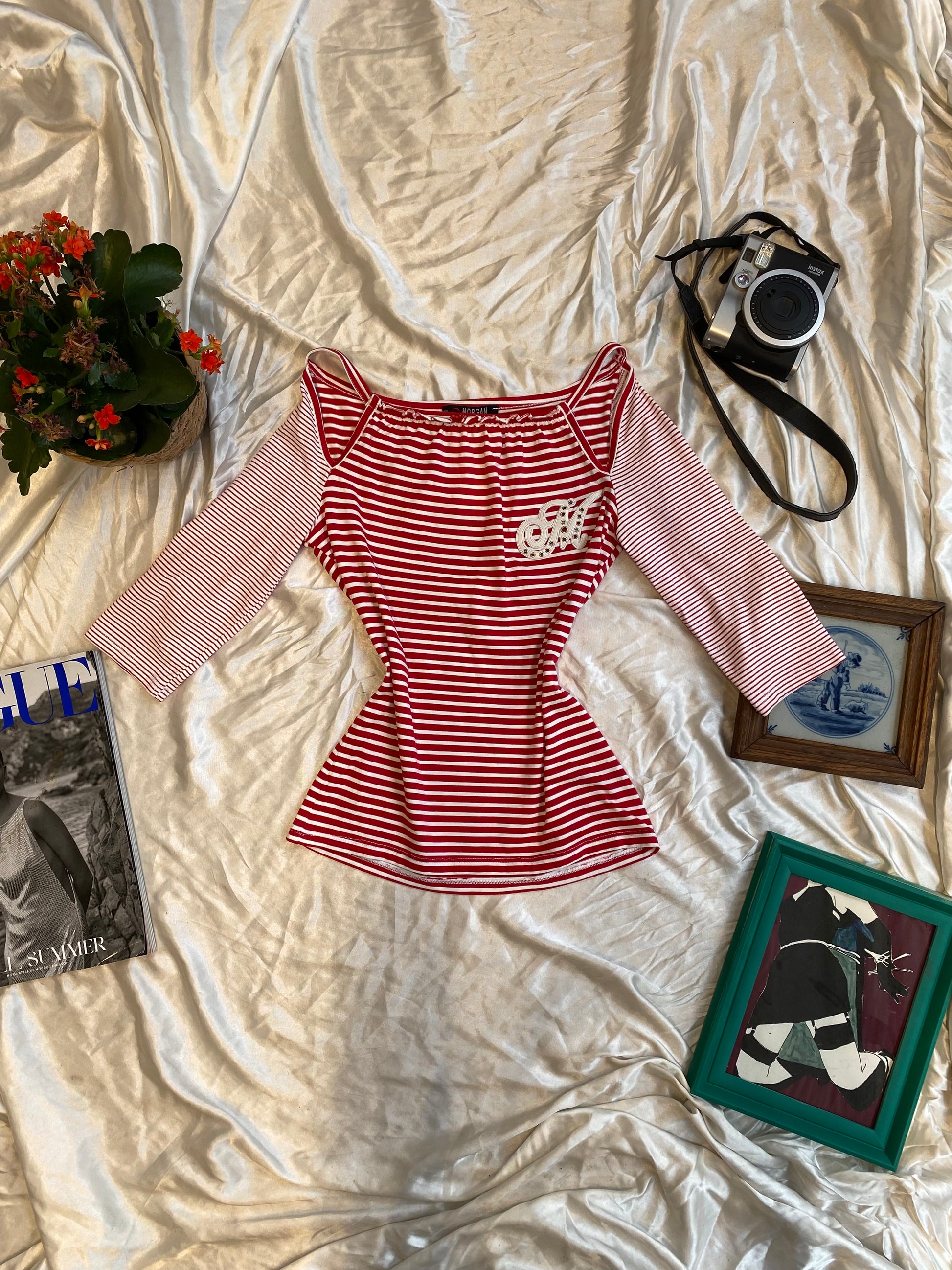 Introducing the Morgan stripped red top with off the shoulder details. This stylish top features a striking red and white striped pattern and flattering off the shoulder design. Crafted from high quality fabric, it offers both comfort and durability. Elevate your wardrobe with this versatile and trendy piece.