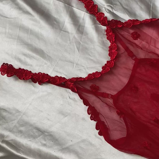 Unleash your playful side with our Red embroidered see through baby doll. The intricate embroidery adds a touch of elegance to this sexy piece. Dare to feel confident and sultry in our baby doll. Step out of your comfort zone and into the bedroom with this irresistible piece.