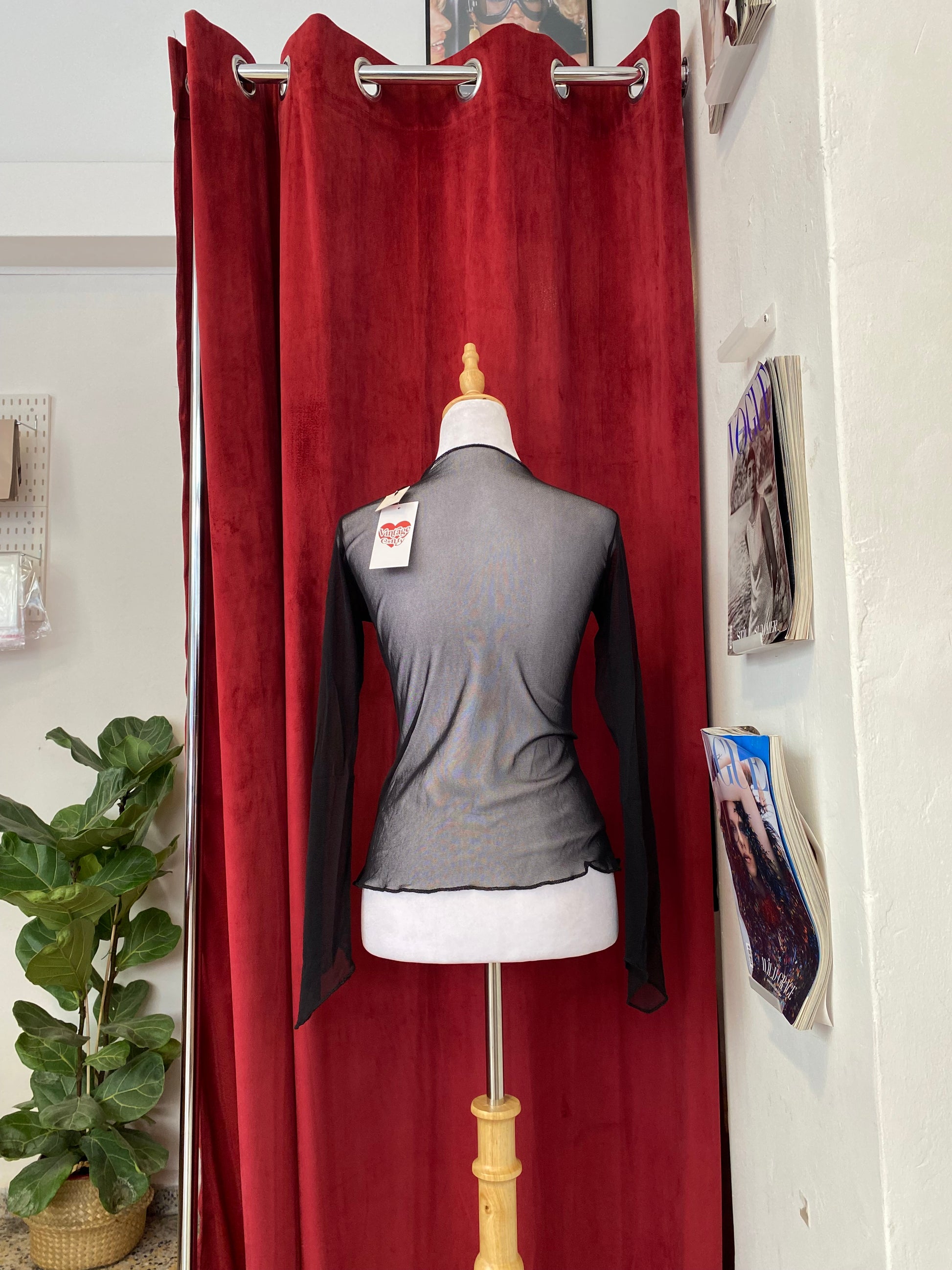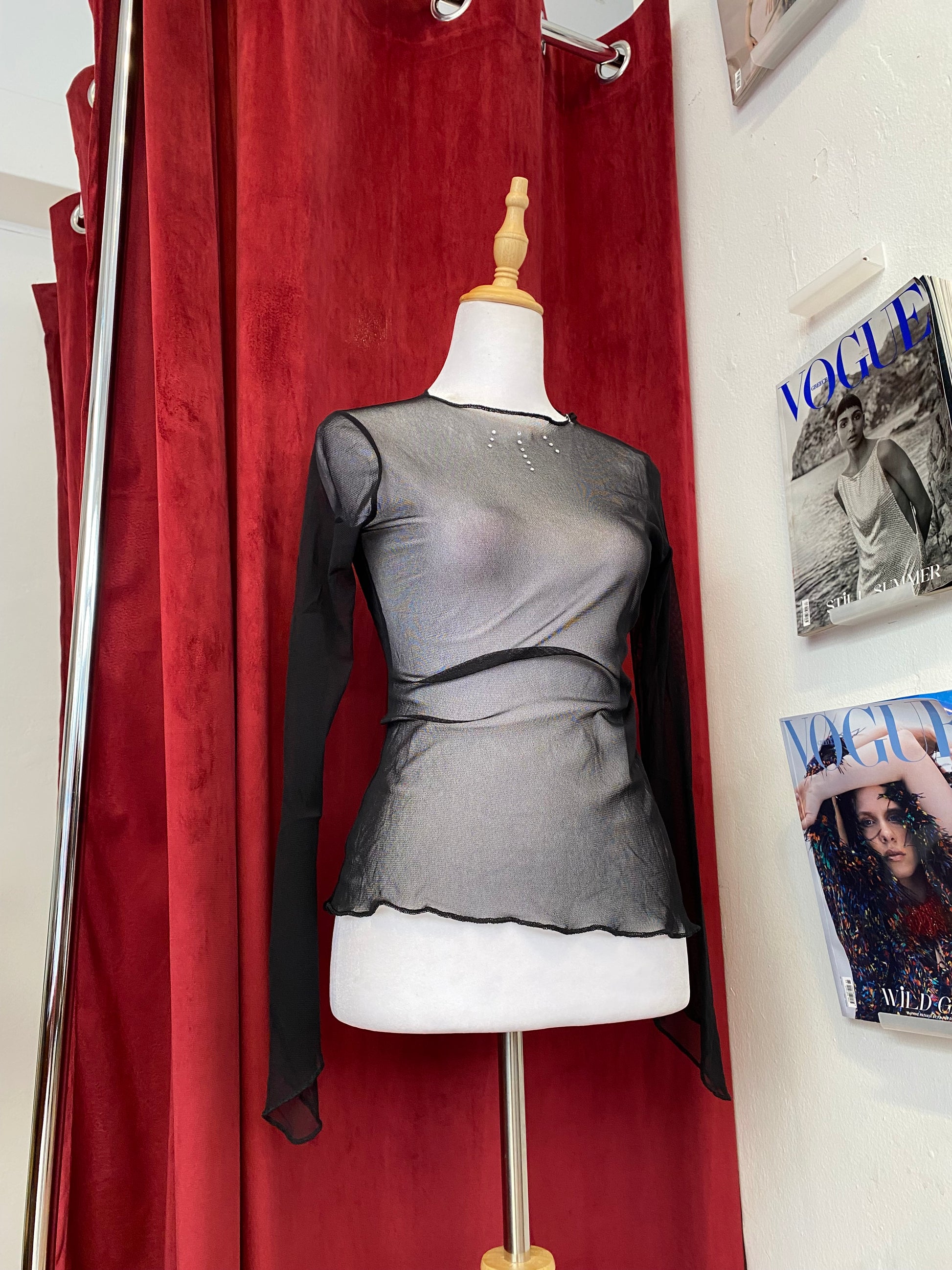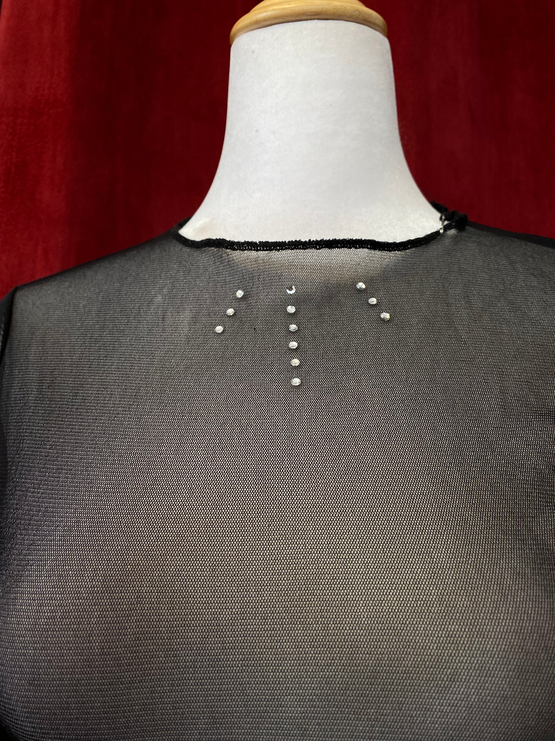 This sheer black top features strategically placed rhinestone details that enhance its visual appeal. The use of sheer fabric allows for breathability, making it suitable for layered outfits or standalone wear. The rhinestones add a touch of elegance, making it appropriate for both casual and formal occasions.