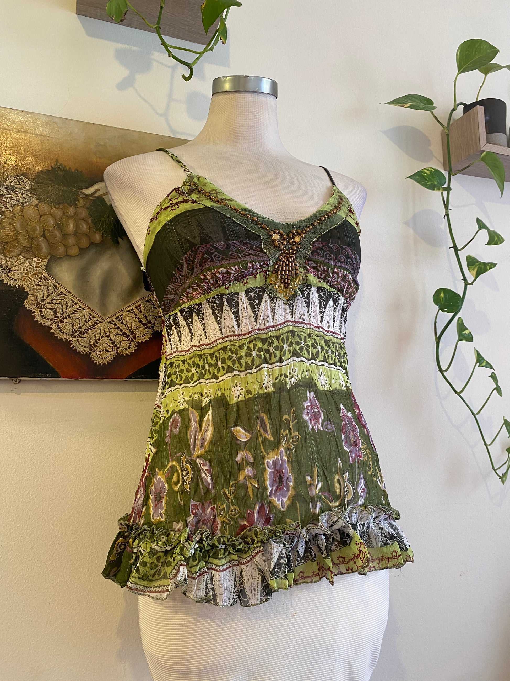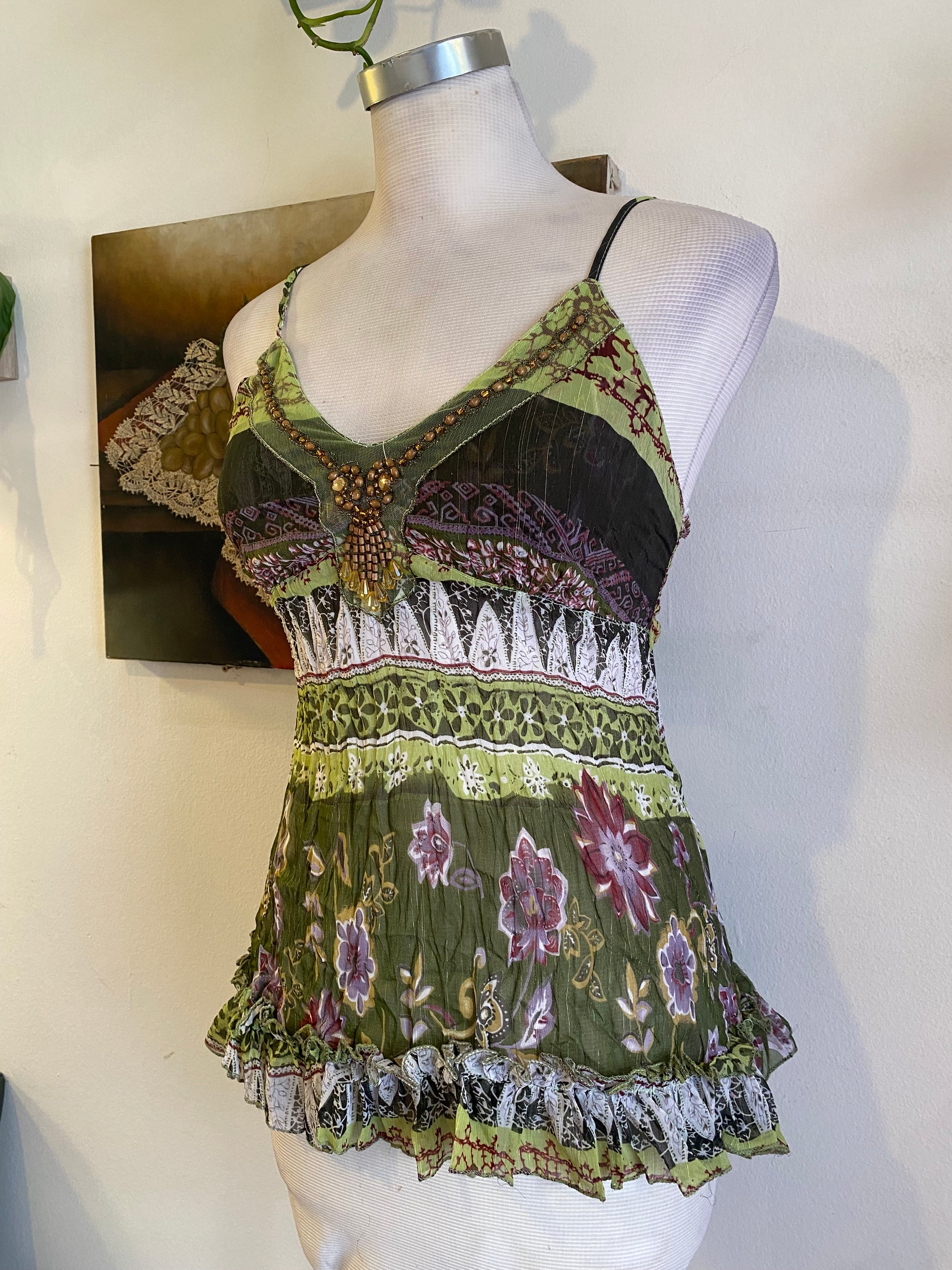 "Take a risk and stand out in this brand new silk beaded top! Featuring vibrant sequins and 25% silk, this must-have summer top is perfect for showing off your bold and adventurous style. Don't miss out on this one-of-a-kind piece!"